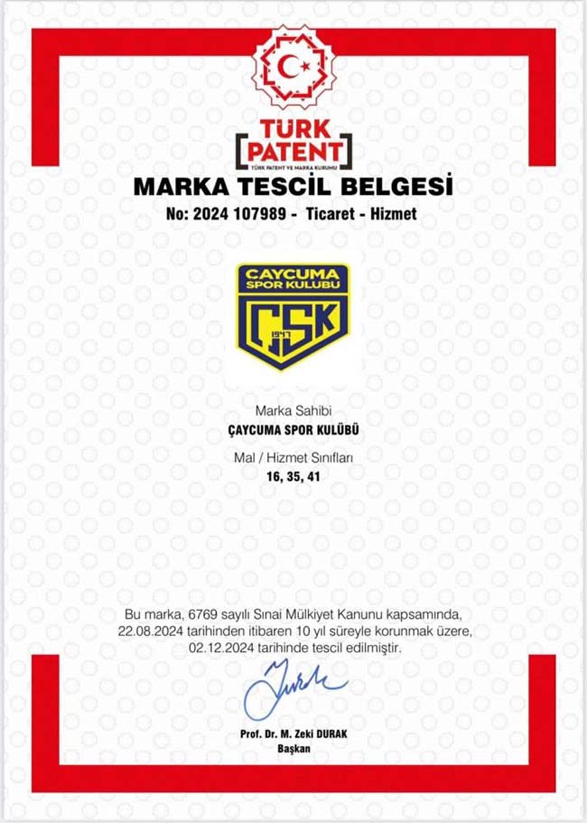 Çaycuma Spor Kulübü, Türk Patent ve Marka Kurumu tarafından “Marka Tescil Belgesi” almaya hak kazandı.