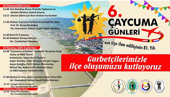 Çaycuma'nın ilçe ilan edilişinin 81. yılı, "6. Çaycuma Günleri" etkinlikleri ile kutlanacak. 18-20 Temmuz tarihlerinde yapılacak etkinlikler içinde konserler, söyleşiler ve sergilerin yanı sıra sünnet şöleni de yer alacak.