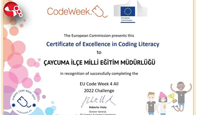 Avrupa Kod Haftası’nda yapılan etkinlik sonucu Çaycuma İlçe Milli Eğitim Müdürlüğü'ne ’Mükemmellik Sertifikası’ gönderildi.