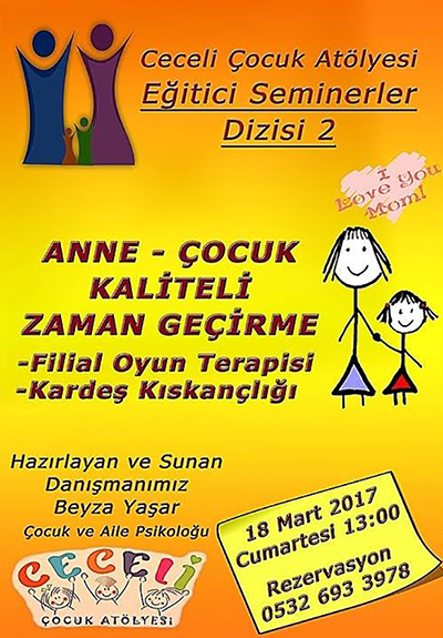 Atölyeden yapılan açıklamaya göre, seminerlerin ikincisinde, Anne-Çocuk Kaliteli Zaman Geçirme Konusu işlenecek. Çocuk ve Aile Psikoloğu Beyza Yaşar'ın hazırlayıp sunduğu seminerde, Filial Oyun terapisi ve Kardeş Kıskançlığı konularında ebeveynlerin davranış modelleri konusunda bilgiler verilecek.