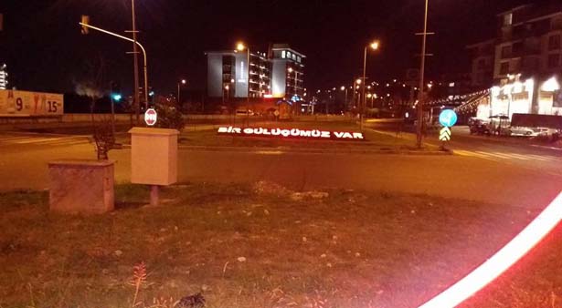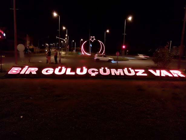 beldemizin ana girişindeki kavşağa "Bire Gülüçümüz var" yazısının yanı sıra
