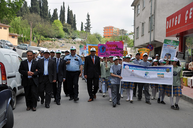 Kasımlı İlköğretim Okulu öğrencilerinin, Okul Müdürü Erdal Yılmaz, Müdür Yardımcısı Bahattin Duman ve öğretmenlerinin nezaretindeki yürüyüşüne, Belediye Başkanı Dr. Nevzat Çimenoğlu, Alaplı İlçe Emniyet Müdürü İsmail Baş, Alaplı Çevre Koruma ve Yardımlaşma Derneği Başkanı Oktay Türkyılmaz ve Dernek yöneticileri, İlçe Milli Eğitim Şube Müdürleri Hüseyin Uysal ve Salih Dirican ile Milletvekili Adayı Hüseyin Yılmaz da katıldı. Öğrencilerin, Alaplı Belediye binası önünden başlayan yürüyüşleri; Hükümet Caddesi, İlçe Emniyet Müdürlüğü binası, Al Caddesi güzergahını takiben Merkez Camii önünde sona erdi. ?Yarının doğası bugünden yaratılır?, ?Yaşanabilir bir dünya için atıkları geri dönüşüme kazandıralım?, ?Kullanılmış plastikler, camlar, kağıtlar çöp değildir?, ?Sağlıklı Yaşam, sağlıklı bir çevre ile olur? şeklinde dövizler taşıyarak yürüyen öğrenciler, yürüyüş boyunca da; ?Alaplı çevrene sahip çık?, ?Temiz çevre istiyoruz?, ?En güzel çevre temiz çevre?, ?Çöpler kutusuna, dünya çocuklara kalsın? şeklindeki, çevre kirliliğine dikkat çekici sloganlar attılar. Öğrencilerin çevre yürüyüşü, hep bir ağızdan ?Çevre Andı?nı söylemeleri ile sona erdi. Yürüyüşün ardından kısa bir açıklama yapan Kasımlı İlköğretim Okulu Müdürü Erdal Yılmaz, okul olarak çevre temizliğine dikkat çekici, çevre temizliğini özendirici etkinlikler düzenlediklerini belirterek, ?Ancak, biz, çevreye karşı duyarlılığın çocuklarla sınırlı kalmamasını, vatandaş duyarlılığının da sağlanmasını istiyoruz. Alaplı?nın merkezinde, köylerinde yaşayan bütün insanlarımızın çevreye duyarlı olmasını vurgulamaya çalışıyoruz. Çünkü, bu dünyayı, bu çevreyi hepimiz birlikte kullanıyoruz. Bundan sonraki nesillerin, çevreye doğaya daha duyarlı olmasını arzu ediyoruz. Çünkü, yaşanabilir bir dünya için temiz bir çevre gerekiyor. Bunu sağlamanın ilk adımları da, küçük yaşlarda okullarda atılıyor. Başta Alaplı Belediyesi?nin ve sivil toplum kuruluşlarının çevre ile ilgili etkinliklerimize desteği de bizleri memnun ediyor. Bu nedenle Alaplı Belediyesi ve sivil toplum kuruluşlarımıza bu desteklerinden dolayı teşekkür ediyoruz. Biz bundan sonra da, Alaplı Belediyesi ve sivil toplum kuruluşlarımızın desteğiyle bu etkinliklerimize devam edeceğiz. Bizimle beraber bu yürüyüşe katılan Belediye Başkanımız Dr. Nevzat Çimenoğlu?na, İlçe Emniyet Müdürümüz İsmail Baş?a, Milli Eğitim Şube müdürlerimize ve bu organizasyonun güvenliğini sağlayan Emniyet personelimize ayrıca teşekkür ediyoruz.? Dedi.