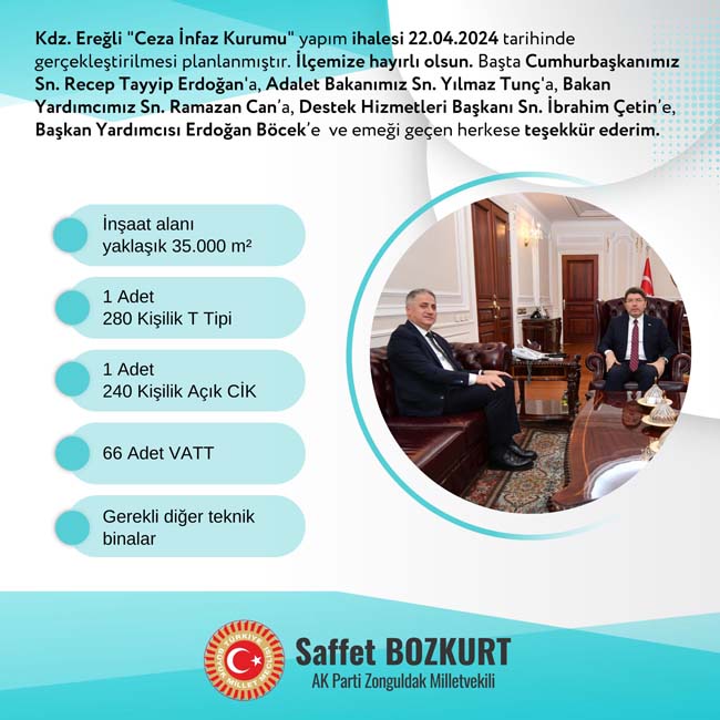 AK Parti Zonguldak Milletvekili Saffet Bozkurt, Karadeniz Ereğli'ye 280 kişilik T Tipi, 240 kişilik de Açık Cezaevi bina yapım ihalesi hakkında şu açıklamayı yaptı;