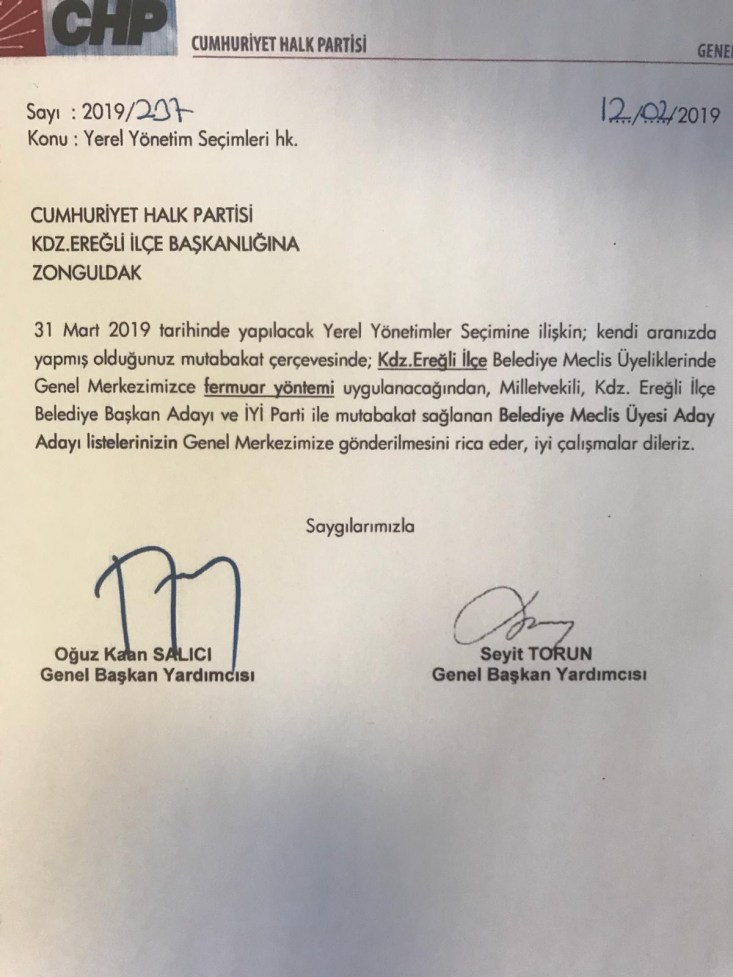 CHP Genel Merkezinden Genel Başkan Yardımcısı Oğuz Kaan Salıcı ve Seyit Torun'un imzasıyla CHP Karadeniz Ereğli İlçe Başkanlığı'na "Yerel Yönetim Seçimleri" başlığıyla gönderilen 12 Şubat tarihli yazıda, "31 Mart tarihinde yapılacak Yerel Yönetimler Seçimine ilişkin; kendi aranızda yapmış olduğunuz mutabakat çerçevesinde; Kdz Ereğli İlçe Belediye Meclis Üyeliklerinde Genel Merkezimizce Fermuar Yöntemi uygulanacağından, Milletvekili, Kdz. Ereğli İlçe Belediye Başkan Adayı ve İYİ Parti ile mutabakat sağlanan Belediye Meclis Üyesi Aday Adayı Listelerinizin genel merkezimize gönderilmesini rica eder, iyi çalışmalar dileriz," denildi.