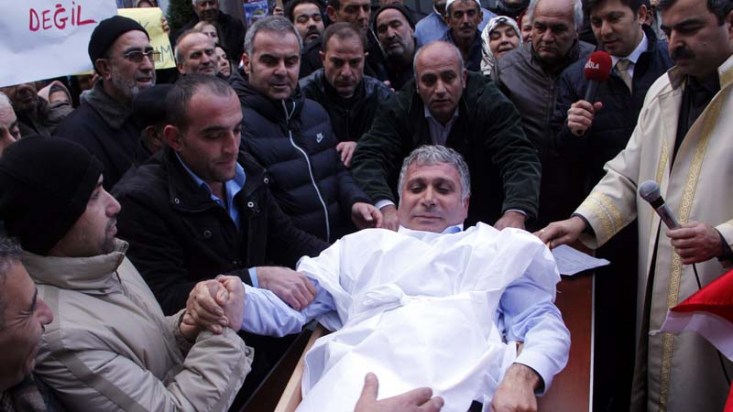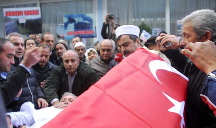 Adnan Akgün ise kefen giyip Türk bayrağına sarılı tabuta girdi. Kilimli