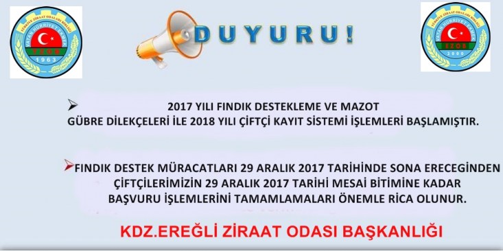 Kdz. Ereğli Ziraat Odası'ndan yapılan açıklamaya göre, 2017 yılı Fındık destekleme ve Mazot Gübre dilekçeleri ile 2018 yılı Çiftçi Kayıt Sistemi işlemleri başladı.