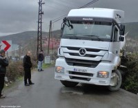 Edinilen bilgiye göre, olay, saat 14.45 sıralarında meydana geldi. Bartın'dan yüklediği 28 ton çimentoyu Kilimli ilçesine bağlı Çatalağzı beldesine götüren H.A. idaresindeki 34 UD 4047 plakalı TIR, seyir halinde giderken yokuş yukarı çıktığı anda hafif şekilde yan yattı. Kazada can kaybı olmazken, trafik kısa süre durdu. Çevredeki vatandaşların yardımıyla trafik kontrollü şekilde sağlanırken, TIR ise gelen vinç yardımıyla yan yattığı yerden çıkarıldı. Öte yandan geçtiğimiz aylarda yine aynı yolda çimento yüklü bir TIR bu şekilde yan yatmış ve çekici yardımıyla çıkarılmıştı.