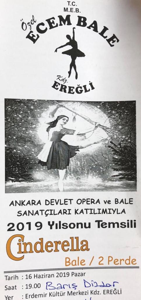 Zonguldak'ın Ereğli ilçesinde Özel Ecem Bale Okulu 2019 yıl sonu temsili olarak Ankara Devlet Opera ve Bale Sanatçılarının katılımıyla Cinderella isimli bale gösterisi gerçekleştirecek.