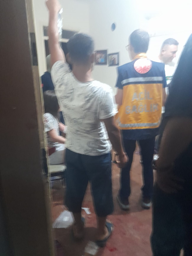 İddiaya göre cinnet getiren Oğuz Ş. (39) beraber yaşadığı ablası Emine (42) eniştesi İhsan (45) ve yeğenleri Berat (20) ile Sude (15) S.'i bıçakladı. Bağırılmaları duyan mahalle sakinleri 112 acil ihbar hattına ihbarda bulunurken, bazı esnaflar da ailenin yardımına koştu. Evde kanlar içinde yatan yaralılara sağlık ekipleri ilk müdahaleyi yaparken yaralılar vakit geçirmeden çeşitli hastanelere kaldırıldı. Olayda yaralanan Emine S. ve Berat S.'in durumlarının ağır olduğu öğrenildi.
