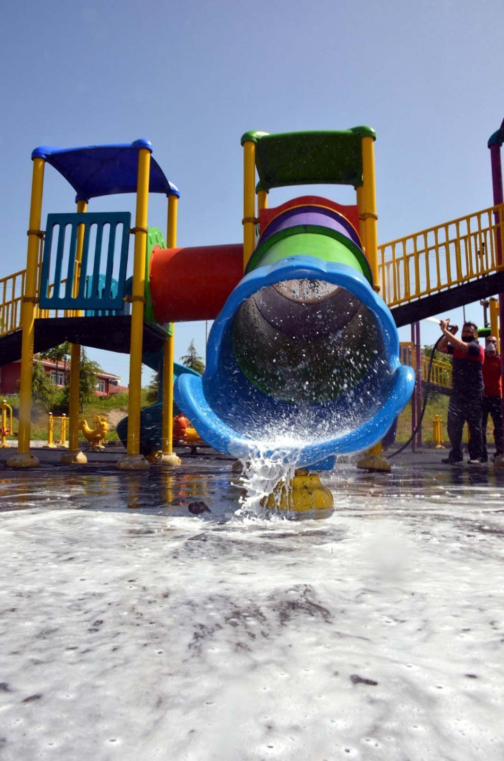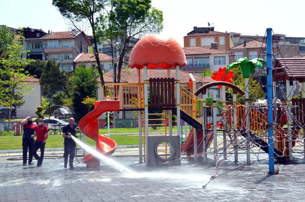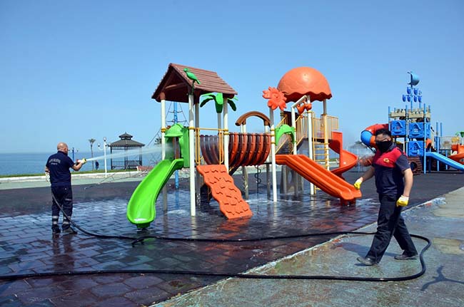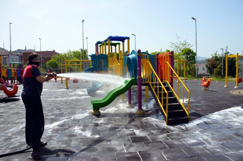 Zonguldak Alaplı İlçe Belediyesi Temizlik İşleri Müdürlüğü ekipleri, Başkan Nuri Tekin talimatı ile bir süredir sokağa çıkmaları kısıtlanan 20 yaş altı gençler ve çocuklara hafta içi verilecek izin dolayısıyla şehirdeki tüm parklarda dezenfekte çalışmaları başlattı