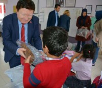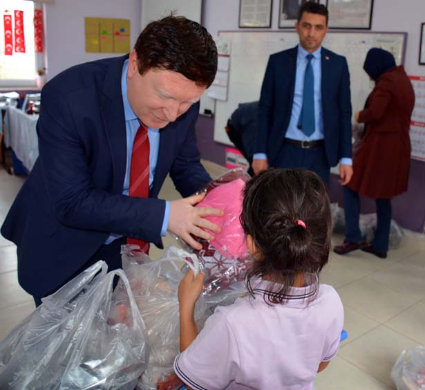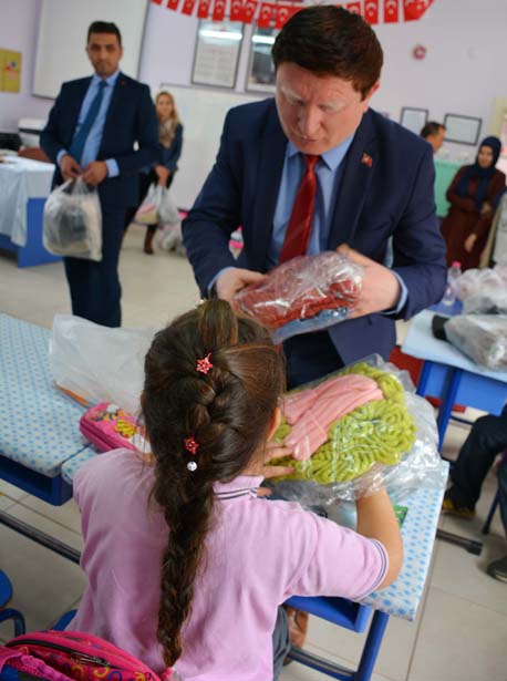 'Çocuklar üşümesin, eğitim devam etsin' projesi kapsamında köy okullarına giyim yardımında bulunduklarını kaydeden Aksoy, bu kapsamda 13 öğrencili Aydınlar Köyü'ndeki ilköğretim Okulu öğrencilerinin kışlık giyim ihtiyaçlarını belediye personeliyle öğrencilere teslim ettiklerini belirtti.