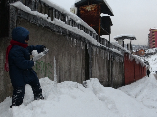 Kent merkezindeki sebze hali binasının çatısından kaldırıma uzanan buz sarkıtlarını kırmaya çalışarak eğlenen çocuklar, tehlikeden habersiz oyun oynuyor. Ellerine aldıkları buzlarla oynayıp kule yapan çocuklar, ?Buzla oynamak tehlikeli değil mi?? sorusuna, ?Tehlikeli ama biz eğleniyoruz işte!? şeklinde cevap veriyor.
