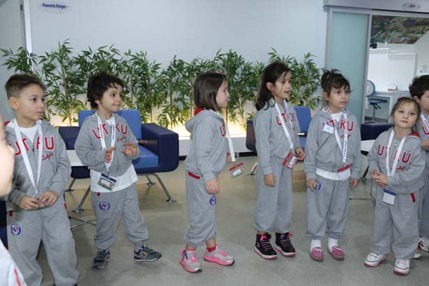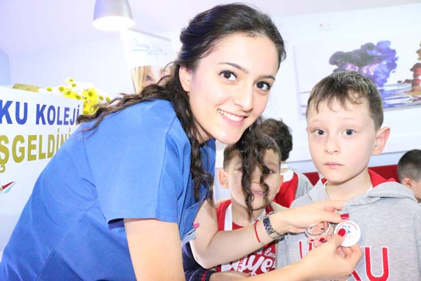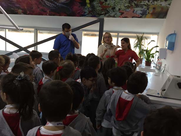 Utku Koleji öğrencileri iki grup halinde öğretmenleri nezaretinde Diş Kliniği'ne gelen minik öğrenciler, Diş Hekimleri Nilgün Şekerci ve Nihat Türkoğlu'ndan diş sağlığı ve bakımı konusunda sinevizyon, drama ve çizgi sinema ve müzik eğitimi aldılar.