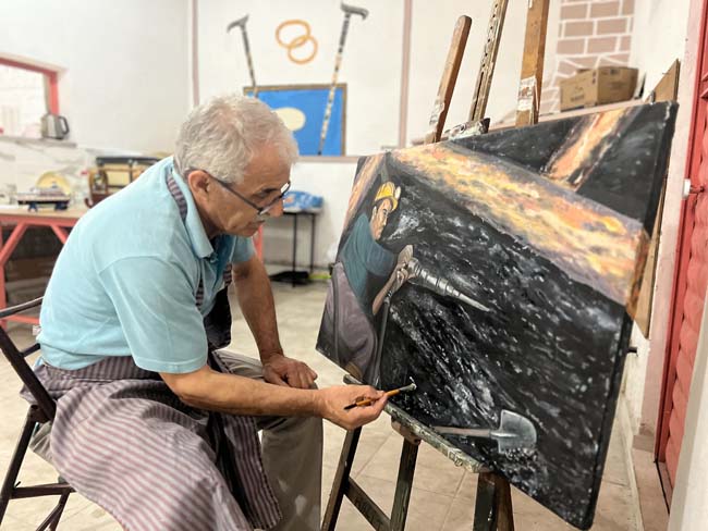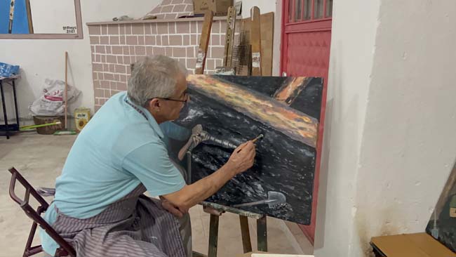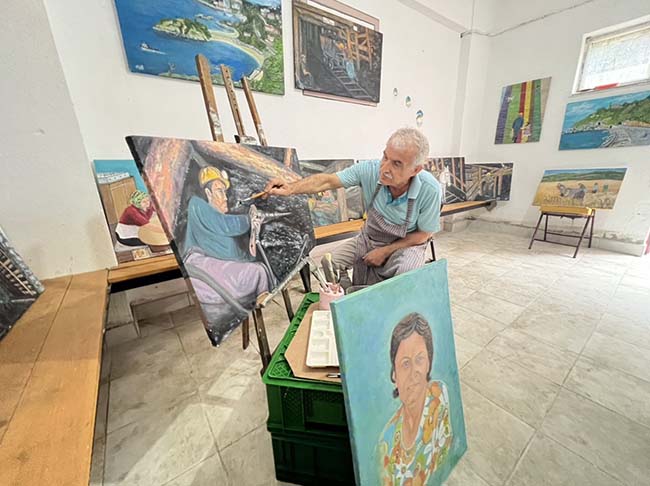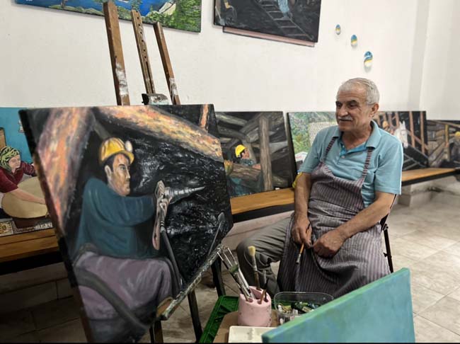 "Ben 68 yaşındayım, eskiden bizim zamanlarımızda böyle resim olaylarına pek değer verilmezdi. Madenden emekli olduktan sonra heves ettim. Halk Eğitimde kurs aldım. Amatör olarak başladığım hobi mesleğinde profesyonel olarak tuvale hislerimi aktarmaya başladım. Eşim korona döneminde kaybettikten sonra uzun bir ara ressamlık yapmadım, daha sonra kendimi çizim yapmaya tuvalleri renklendirme başladım. Eşimin portresini tuvale yağlı boya ile çizdim. Ben madenci torunuyum. Bölgemizde kısa zamanlarda madenci şehitleri olduğu için kendimi madencilerimizi kahramanlarımızı yağlı boya ile resimlerini yapmaya başladım. Bir vefa borcu olarak gördüğüm için madencilerimiz ile alakalı resimlerimi müzelerde kahramanlarımızı farklı illerde tanıtarak sergi yapmayı çok istiyorum. Ben ressamlıktan arta kalan zamanlarımda ise el emeği ürünler yaparak vakit geçiriyorum."