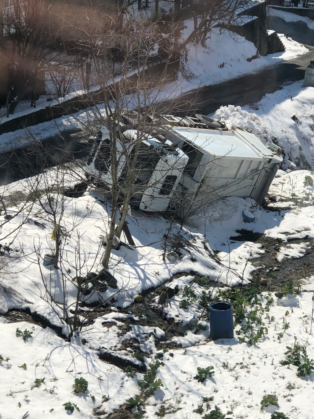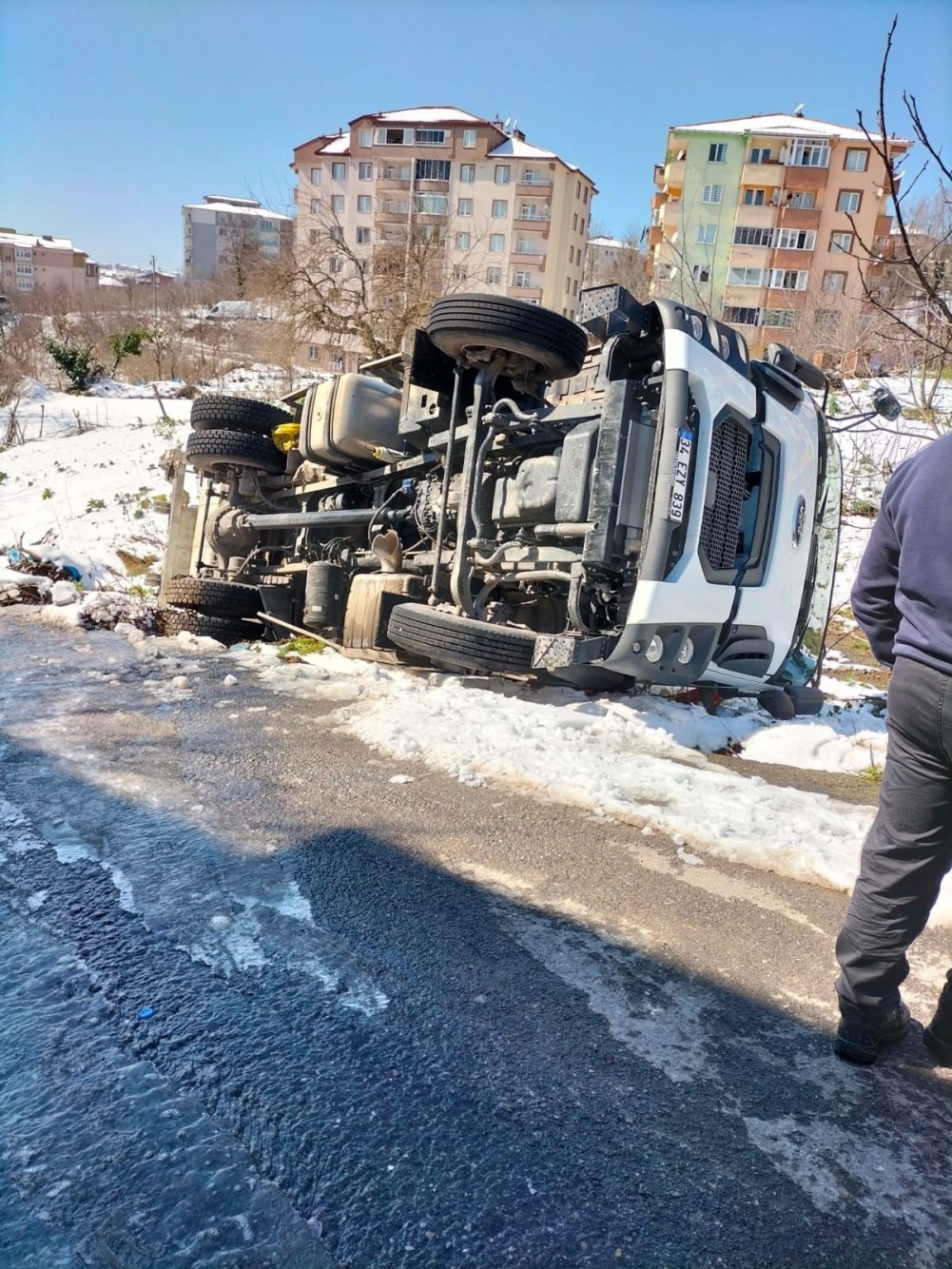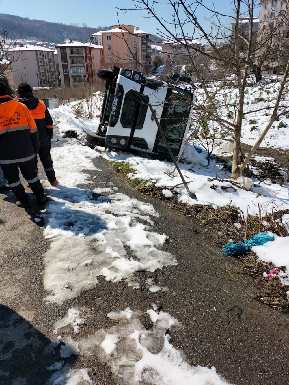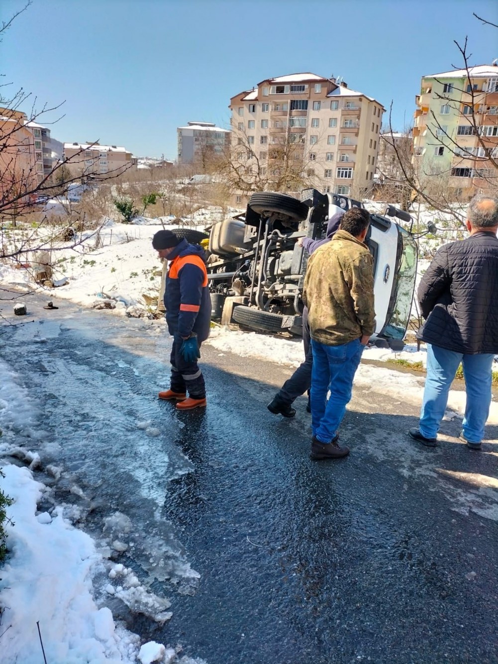 İtfaiye göre seyir halindeki 34 EZY 839 plakalı çöp kamyonu yerdeki buzlanmadan dolayı kayarak yan yatarak tarlaya girdi. Şans eseri yaralanan olmazken maddi hasar meydana geldi. Olay yerine gelen çekici yardımıyla çöp kamyonu bulunduğu yerden kaldırıldı.