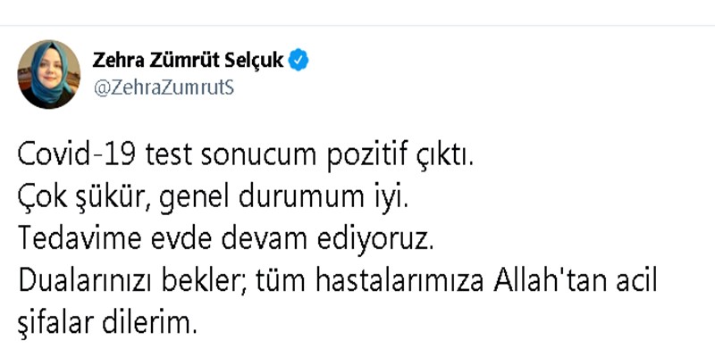 "Covid-19 test sonucum pozitif çıktı. Çok şükür, genel durumum iyi. Tedavime evde devam ediyoruz. Dualarınızı bekler, tüm hastalarımıza Allah'tan acil şifalar dilerim."