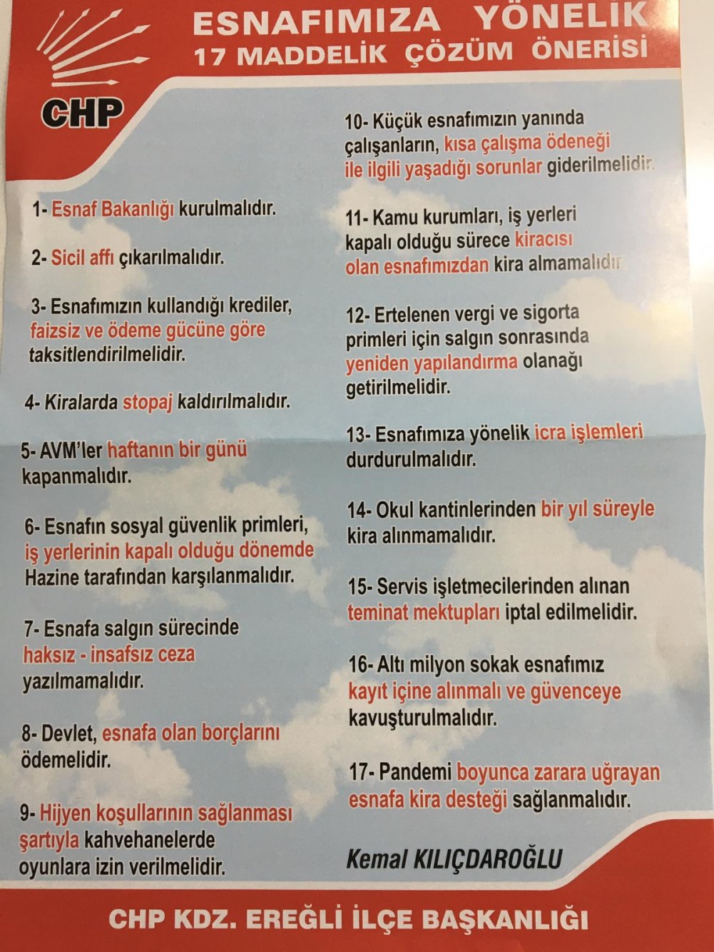 CHP Genel Merkezi tarafından, Esnafımıza yönelik hazırlanan 17 maddelik çözüm önerileri ile ilgili bilgilendirme broşürleri, CHP Kdz. EReğli İlçe Yönetim Kurul Üyelerii tarafından dağıtıldığı bildirildi.