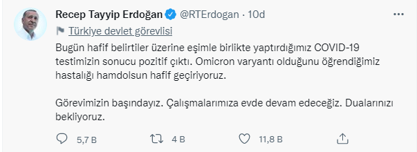Cumhurbaşkanı Erdoğan, Twitter'dan yaptığı açıklamada, bugün hafif belirtiler üzerine eşi Emine Erdoğan ile birlikte test yaptırdıklarını ve sonucun pozitif çıktığını belirtti.
