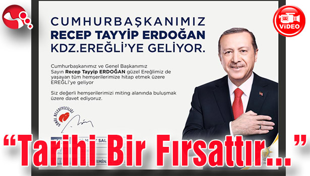 Cumhurbaşkanı ve AK Parti Genel Başkanı Recep Tayyip Erdoğan 19 Mart 2019 Salı günü Saat 12.00'de Kdz. Ereğli ilçesini ziyaret edecek. AK Parti Kdz. Ereğli Belediye Başkan Adayı Erol Şahin tüm ilçe halkını 19 Mart'ta gerçekleşecek olan mitinge davet etti.