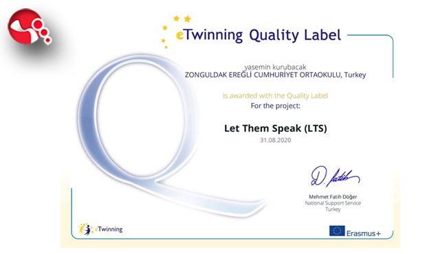 Zonguldak’ın Ereğli İlçesindeki Cumhuriyet Ortaokulu’nun, Avrupa ülkeleri arasında sürdürülen E-Twinning Projesi kapsamında, “Bırak Konuşsunlar (Let Them Speak)” Projesi ile “Ulusal Kalite Etiketi” alma hakkı elde ettiği öğrenildi.