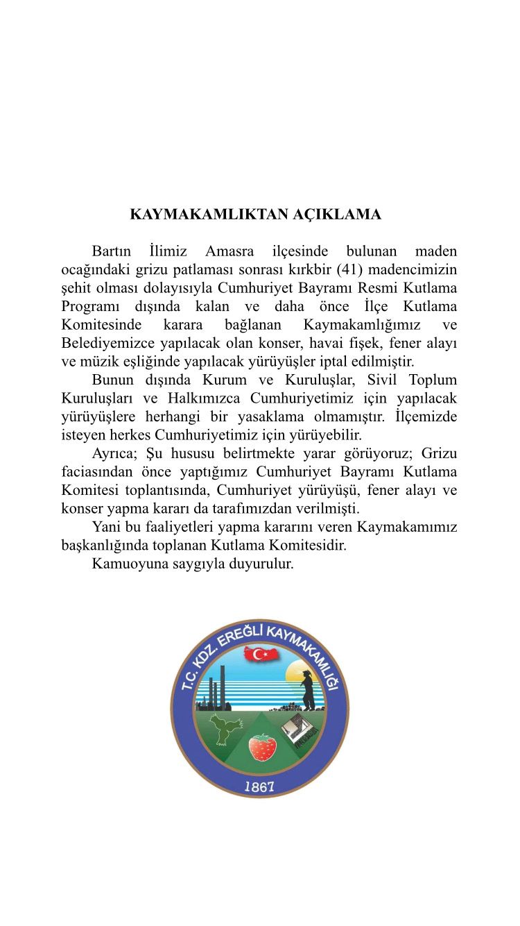 “Bartın ilimiz, Amasra ilçesinde bulunan maden ocağındaki grizu patlaması sonrası kırkbir (41) madencimizin şehit olması dolayısıyla Cumhuriyet Bayramı Resmi Kutlama programı dışında kalan ve daha önce İlçe kutlama Komitesinde karara bağlanan Kaymakamlığımız ve Belediyemizce yapılacak olan konser, havai fişek, fener alayı ve müzik eşliğinde yapılacak yürüyüşler iptal edilmiştir.