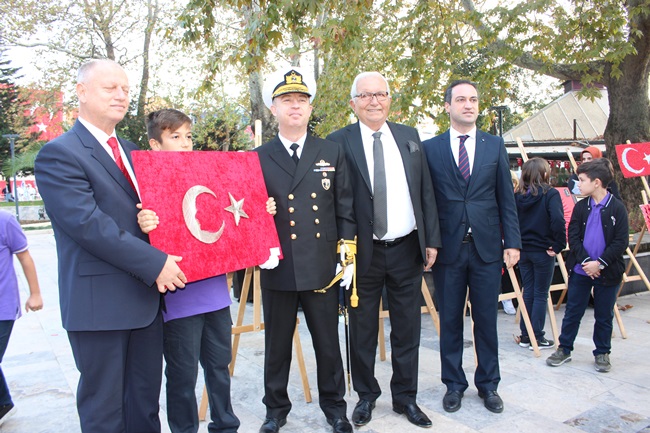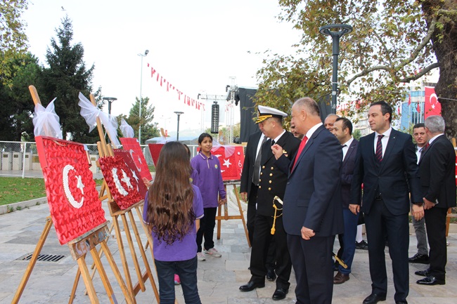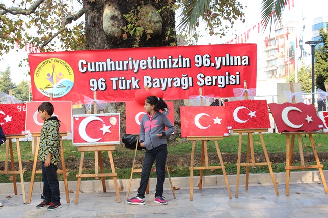 Tören alanında Cumhuriyet Ortaokulu öğrencileri tarafında düzenlenen ve değişik metaryallarden üretilen ’96 Türk Bayrağı Sergisi’ katılımcıların yoğun ilgisini çekti.