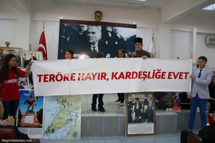 Kaçmaz ve öğrenciler programın sonunda "Teröre hayır, kardeşliğe evet" pankartı açtı.