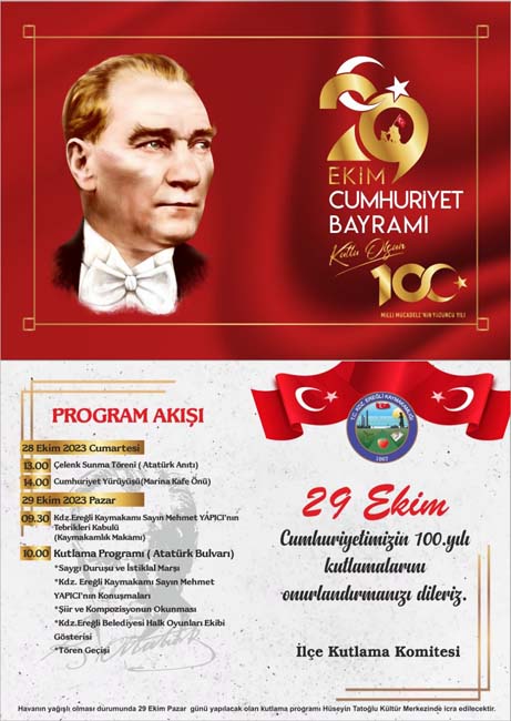 Karadeniz Ereğliİ’de 29 Ekim Cumhuriyet Bayramı’nın 100. yılı kutlama programı belli oldu.