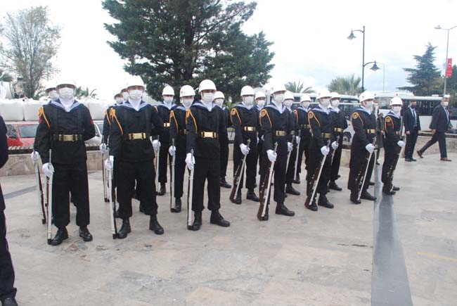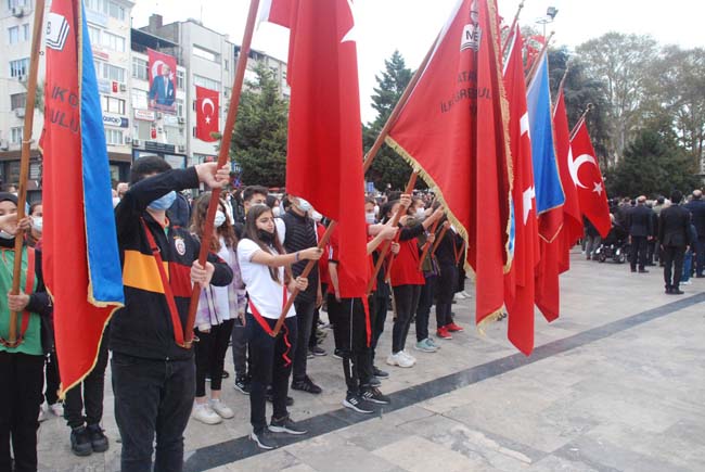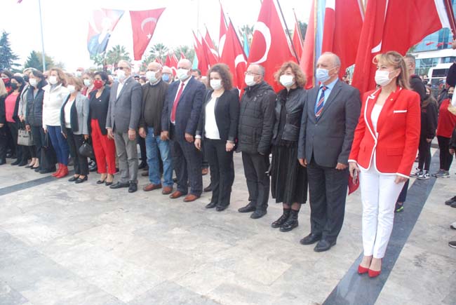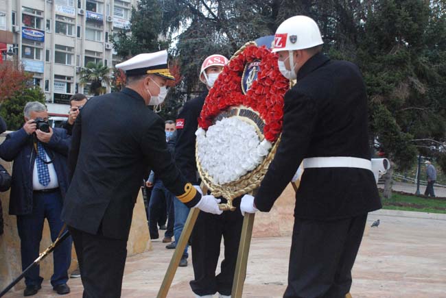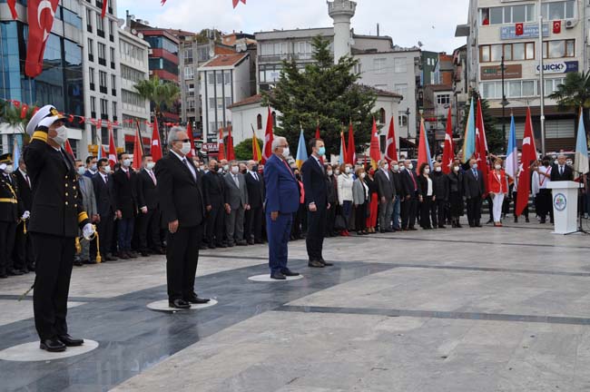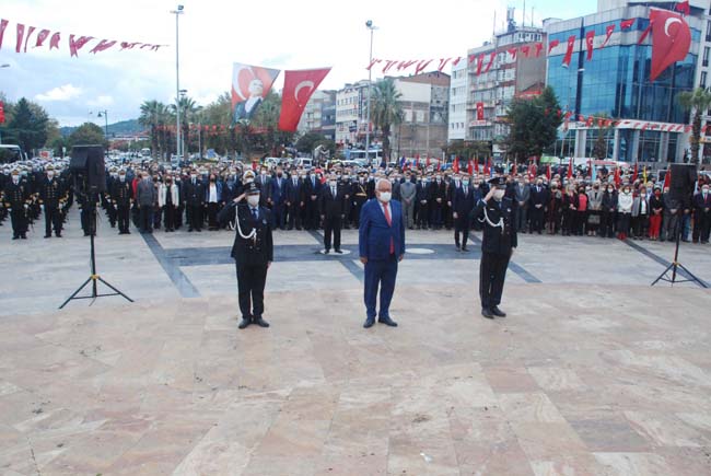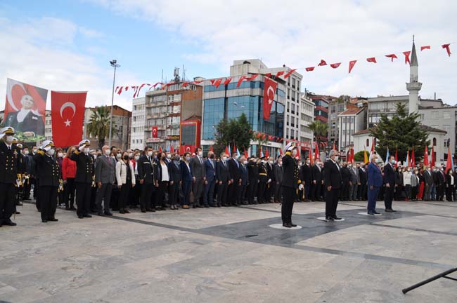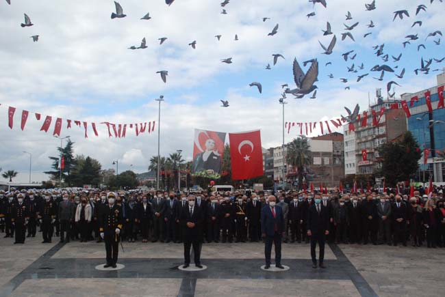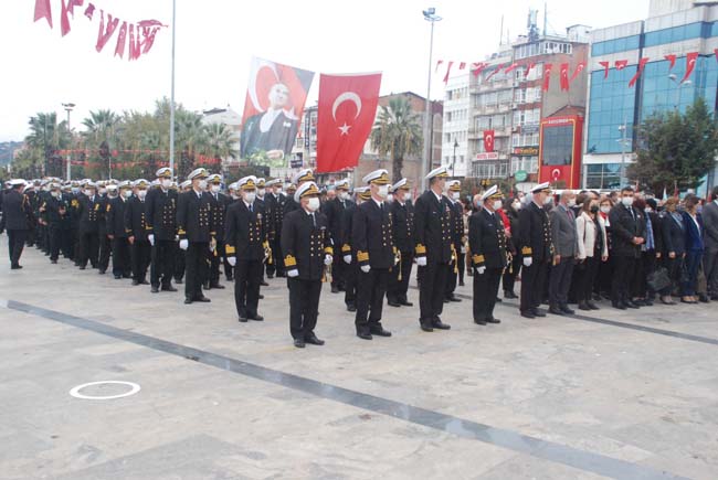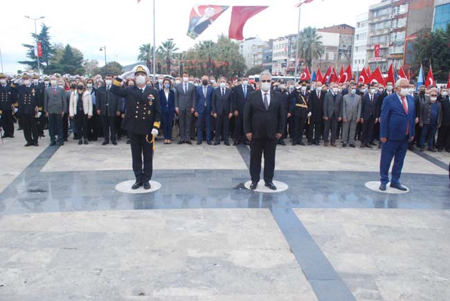 Atatürk Anıtı alanındaki törende, Ereğli Kaymakamı Mehmet Yapıcı, Karadeniz Bölge ve Garnizon Komutanı Tuğamiral Niyazi Uğur, Ereğli Belediye Başkanı Halil Posbıyık; Atatürk Anıtı’na çelenk koydular. Törende, Saygı Duruşunda bulunularak İstiklal Marşı’nın okunmasıyla göndere Türk Bayrakları çekildi, Askeri Erken selam duruşuna, okulları temsilen öğrenciler Türk Bayrakları ve Okul filamalarıyla hazır duruşa geçtiler.