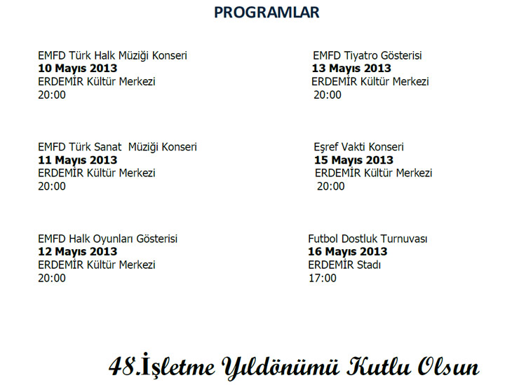 Türkiye'nin yüzakı, Ereğli'nin pırlanta yüzük taşı ERDEMİR, kuruluşunun 48. yılını çeşitli etkinliklere kutlayacak.