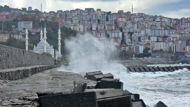 Zonguldak'ta şiddetli rüzgar etkili oldu. Kentin en işlek noktalarından Liman Caddesi'nde dalga boyu zaman zaman 7 metreyi aştı.