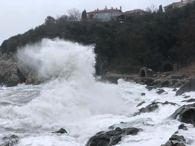 Zonguldak’ta gece saatlerinden itibaren sağanak ile etkili olan şiddetli rüzgar nedeniyle Liman Caddesi’nde dev dalgalar mendireği aştı.