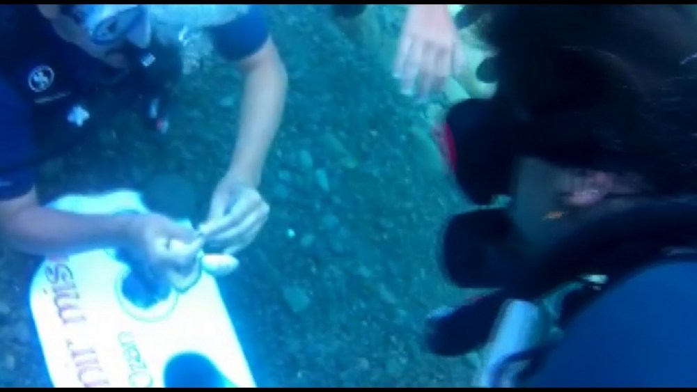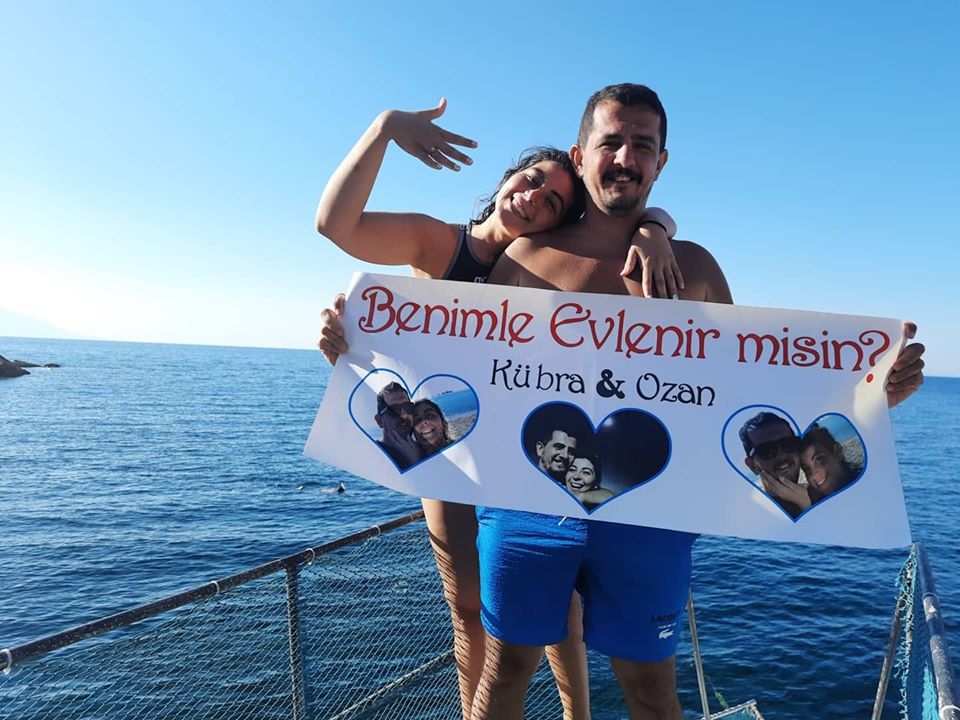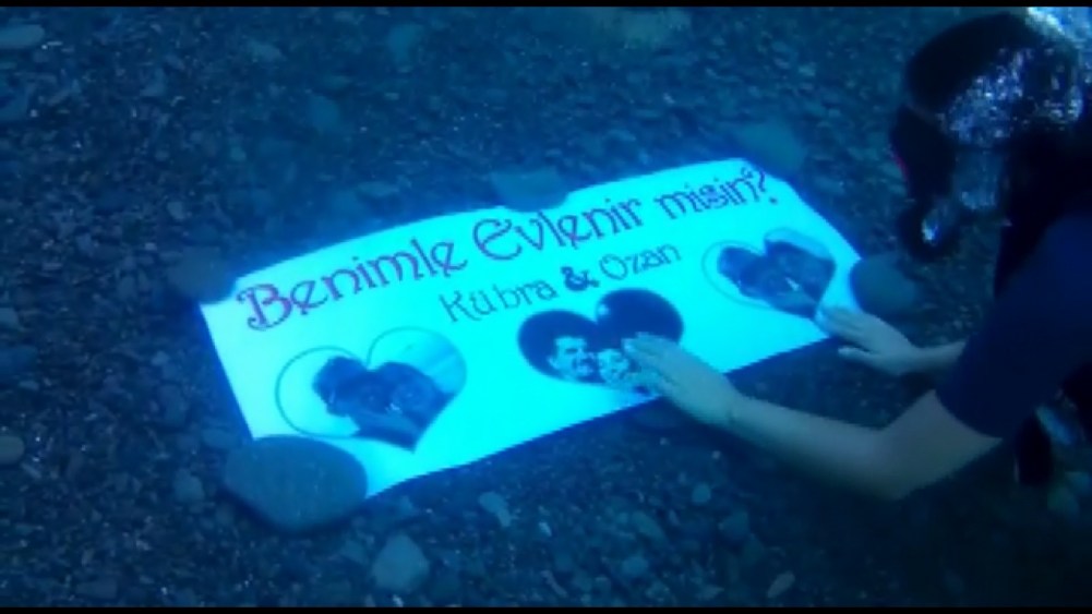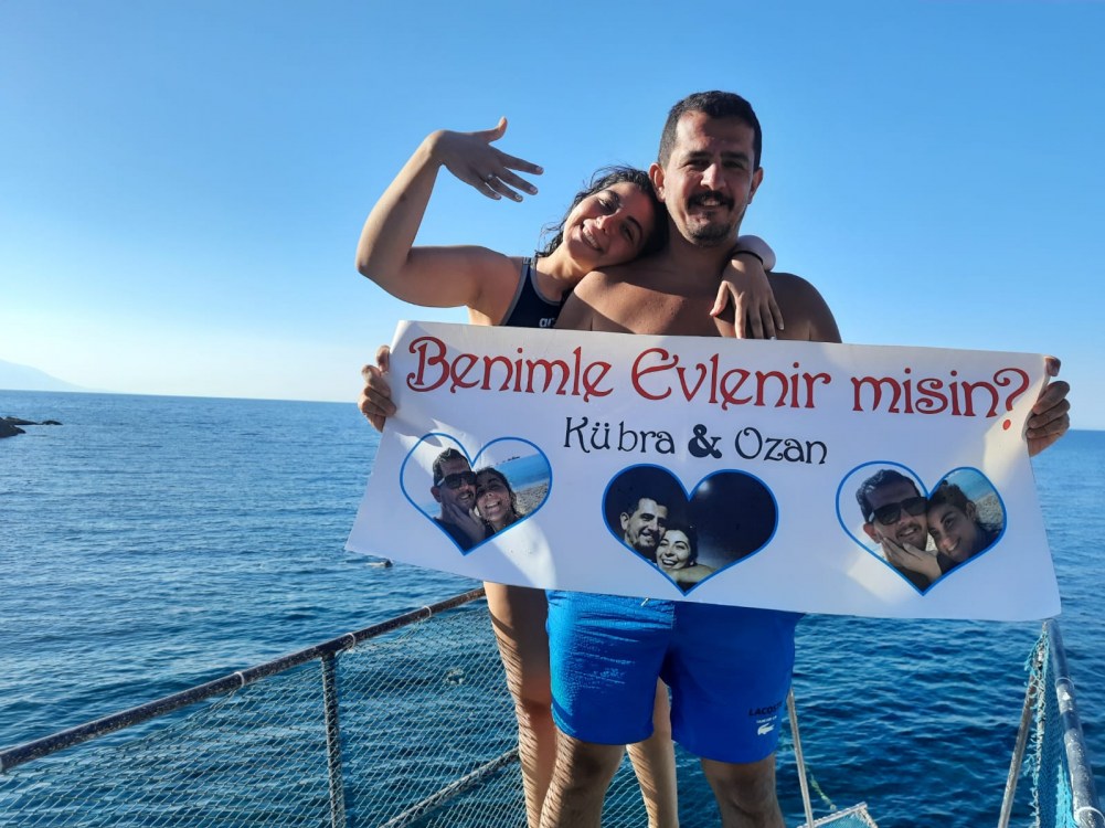 Denizi çok seven kız arkadaşı Kübra Özkan’a birlikte dalma teklifinde bulunan Ender Ozan Albayrak, dalış okulu yetkilileri ile görüşerek yardım istedi. Dalış okulu yetkililerinin istediği pankartı yaptıran Albayrak, dalış okulu görevlileri ile yaptıkları dalışta pankartı gören kız arkadaşı Kübra Özkan’a deniz kabuğunun içinde ki yüzüğü çıkararak evlenme teklifini gerçekleştirdi.