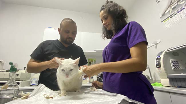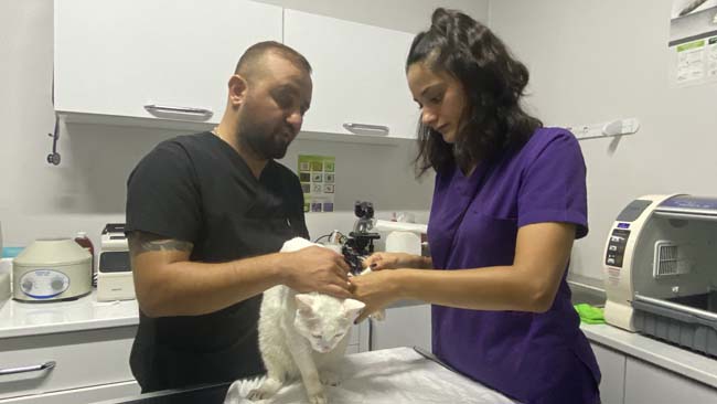 Veteriner Gökmen Koç, “Perşembe günü 7’inci kattan düşme şikayetiyle kediyi getirdiler. Yapılan muayenede diyaframda bir şey yok. Bizim için en önemlisi. İç kanama riski de çok azdı. Biz yine kanama durdurucuları yaptık. Bir diğer yetkinde damağının yırtıldığını gördük. Baya geniş bir yırtıktı. 72 saatlik operasyonun ardından kontrole aldık. Damağına diktik ameliyatın üçüncü günü. 1 haftalık süre içerisinde sadece ıslak gıdalar tüketebilecek. Mizacı da çok sevimli. Baya tehlikeli bir yükseklik yedinci kat. Şuan her şey yolunda. Yedinci kat baya bir yükseklik. Aman yırtıklığında akciğerler bir kaçış olabiliyor. Akciğerlerde sıvı toplanması gerçekleşebiliyor. Ama damak tuttuğu zaman böyle bir problem kalmayacak” dedi.