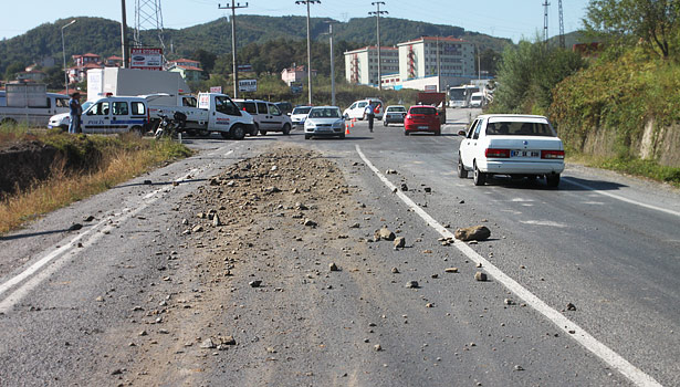 Ereğli'de kamyondan dökülen hafriyat Zonguldak İstanbul karayolunun tek şeridini kapattı. Belediye temizlik ekiplerinin yaptığı çalışma sonrasında yol 30 dakikalık gecikmeyle yeniden trafiğe açıldı.
