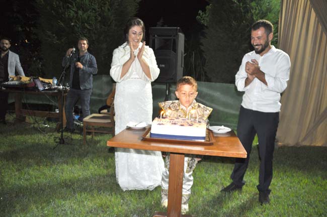 Gamze-Ertunç ve erkekliğe ilk adımını atan Beyazıd Dinçel sahneye davet edilerek sünnet pastası kesildi.