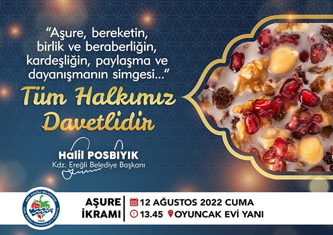 Kdz. Ereğli Belediyesi tarafından Muharrem ayı dolayısıyla 12 Ağustos Cuma günü saat 13.45’te Oyuncak Evi yanında Aşure ikramında bulunulacağını duyurdu.