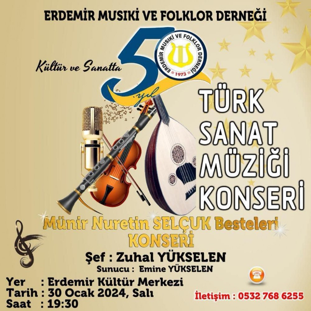 Erdemir Musıki ve Folklor Derneği Türk Sanat Müziği korosu şefi Zuhal Yükselen, eğitmenliğinde, Derneğin kuruluşunun Kültür Sanatta 50. Yılı dolayısıyla bir konser düzenleneceği açıklandı. Bu seneki sanat müziği konseri, Münir Nurettin Selçuk’un eserlerinden oluşacak.