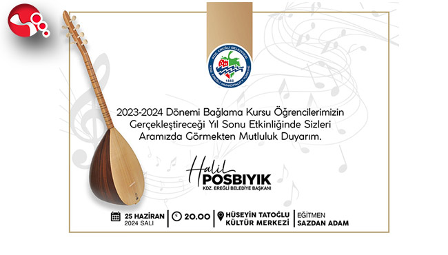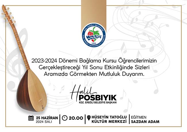 Kdz. Ereğli Belediyesi 2023-2024 dönemi Bağlama Kursu öğrencileri tarafından 25 Haziran 2024 Salı ‘Yıl Sonu Etkinliği’ düzenlenecek.