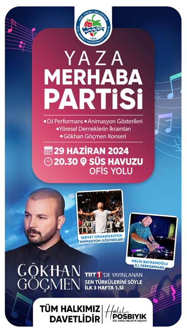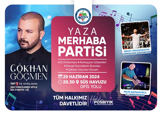Cumartesi günü akşamı sahil süs havuzu bölgesinde Dj performans, Animasyon Gösterileri, Yöresel Derneklerin İkramları ve TRT1’de yayınlanan Sen Türkülerini Söyle yarışmasının ilk 3. hafta birincisi Gökhan Göçmen’in konserinin yer alacağı Yaza Merhaba Partisi yapılacak. Belediye Başkanı Halil Posbıyık etkinliklere vatandaşları davet etti.