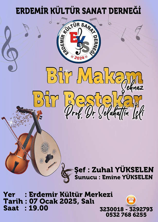 7 Ocak Salı günü Erdemir Kültür Merkezinde saat 19.30 da düzenlenecek konseri Şef Zuhal Yükselen yönetecek.’ Bir Makam Bir Bestekâr’ temalı konserde, Merhum Bestekâr DR. Selahattin İçli’nin eserleri seslendirilecek. Koro ve Solo sanatçıları tarafından seslendirilecek Türk Sanat Müziği Konserine tüm Ereğli halkı davetlidir.