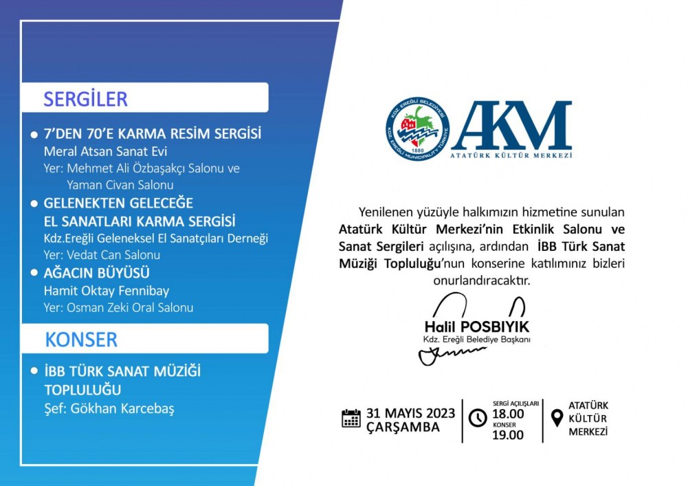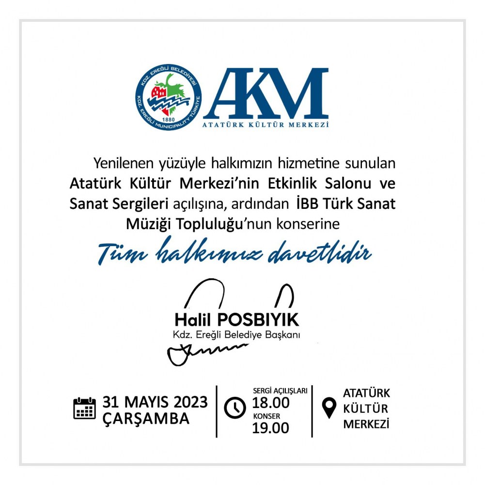 Yenilenen yüzüyle halkımızın hizmetine sunulan Atatürk Kültür Merkezi’nin Etkinlik Salonu ve Sanat Sergilerinin açılışları, 31 Mayıs Çarşamba gerçekleşecek. Açılış sonrasında İBB Türk Sanat Müziği Topluluğu da dinleyicilere müzik ziyafeti sunmaya hazırlanıyor.