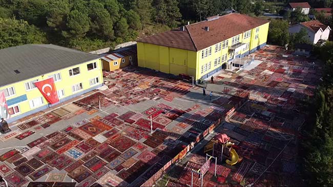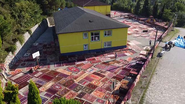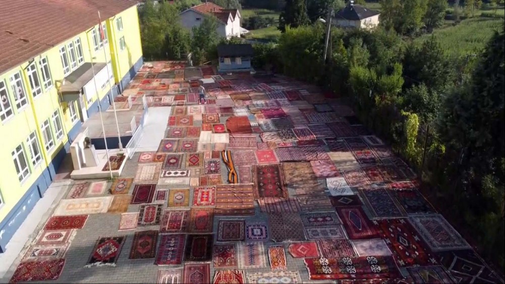 Zonguldak’ın Çaycuma ilçesi Karapınar beldesinde faaliyet gösteren tekstil fabrikası sahibi Gökhan Gözbaşı, dedesinden miras kalan dokuma halı ve kilimleri çocuklarına miras bırakacak. 3 bine yakın halı ve kilimi her yıl sererek havalandıran Gözbaşı, bakımı masraflı olmasına rağmen hobisini sürdürüyor. Gözbaşı'nın bir okulun bahçesine havalanması için serdiği halı ve kilimler dron ile havadan görüntülendi.