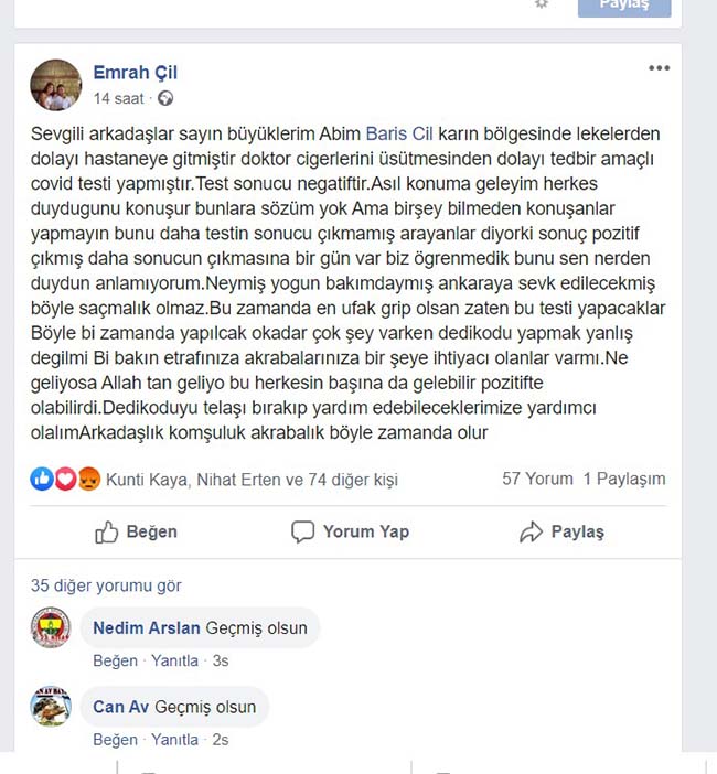 Çil yaptığı paylaşımında “Sevgili arkadaşlar sayın büyüklerim, Abim Barış Çil karın bölgesinde lekelerden dolayı hastaneye gitmiştir. Doktor ciğerlerini üşütmesinden dolayı tedbir amaçlı covid testi yapmıştır. Test sonucu negatiftir. Asıl konuma geleyim. Herkes duyduğunu konuşur. Bunlara sözüm yok. Ama bir şey bilmeden konuşanlar yapmayın bunu. Daha testin sonucu çıkmamış. Arayanlar diyor ki sonuç pozitif çıkmış. Daha sonucun çıkmasına bir gün var. Biz öğrenmedik bunu sen nerden duydun anlamıyorum. Neymiş yoğun bakımdaymış. Ankara’ya sevk edilecekmiş. Böyle saçmalık olmaz. Bu zamanda en ufak grip olsan zaten bu testi yapacaklar. Böyle bir zamanda yapılacak o kadar çok şey varken, dedikodu yapmak yanlış değil mi? Bir bakın etrafınıza akrabalarınıza, bir şeye ihtiyacı olanlar var mı? Ne geliyorsa Allah’tan geliyor. Bu herkesin başına da gelebilir ve pozitifte olabilirdi. Dedikoduyu, telaşı bırakıp yardım edebileceklerimize yardımcı olalım. Arkadaşlık komşuluk akrabalık böyle zamanda olur”