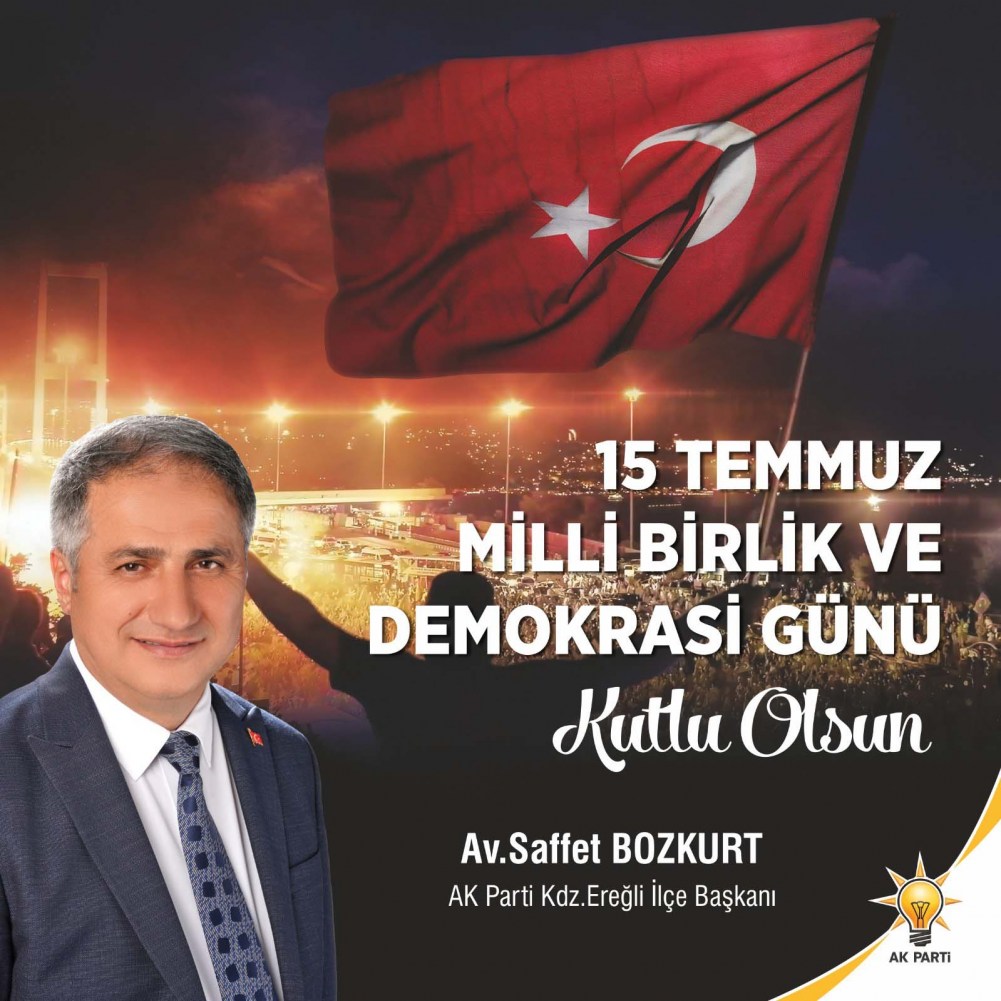 AK Parti Kdz. Ereğli İlçe Başkanı Av. Saffet Bozkurt; “FETÖ tarafından 15 Temmuz 2016’da milletimizin iradesine, Cumhuriyetimize ve geleceğimize yönelik yapılan hain darbe girişimi karşısında halkımız sokaklara inerek darbe girişimini bozguna uğratmıştır” dedi.