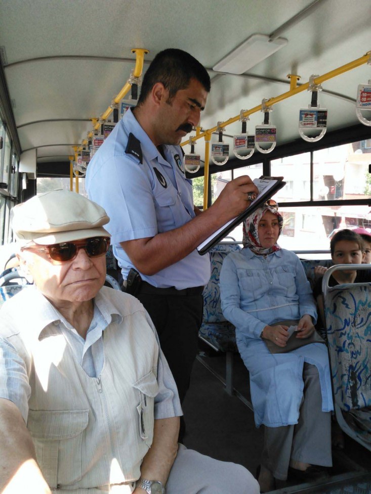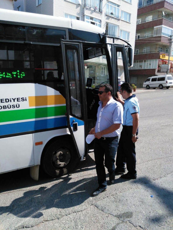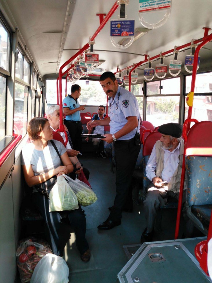 Zabıta Müdürlüğünde görevli zabıta memurları, sivil kıyafetlerle katıldıkları denetimde Kadıtarlası Hatip Sokak Adliye Önü Kemer ve Aktaş duraklarında faaliyet gösteren halk otobüslerine binerek şoförlerin kılık-kıyafet, ruhsat, temizlik, hat ve durak takibi ile özellikle yaz aylarında açılması gereken klimalar ile yürürlükte olan yönetmeliklere uygun hareket edip etmediklerini denetledi.