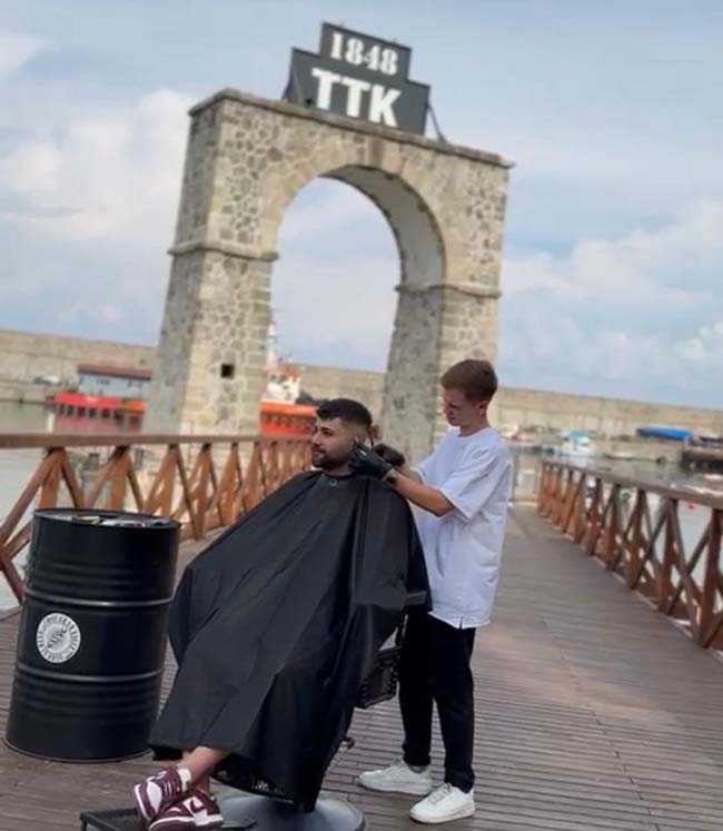Zonguldak’ta 19 yaşındaki genç kuaför Efkan Çapri, müşterisini limanda tıraş edip sosyal medya hesabında paylaştı. Deniz manzarası eşliğinde yapılan tıraş büyük ilgi gördü.
