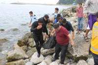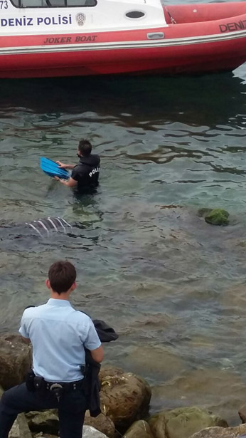 Olay yerine çağrılan deniz polisi tarafından denizde ceset torbasına konularak