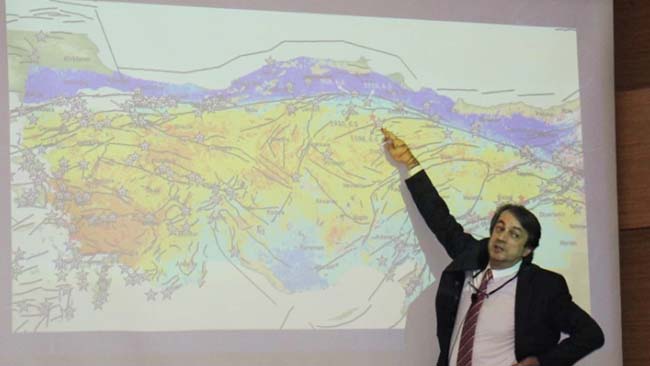 Prof. Dr. Şenol Hakan Kutoğlu, deprem konulu sunumunda Türkiye’nin her tarafında fay olduğunu dile getirerek depremden kaçmanın mümkün olmadığını ve depremle yaşamayı öğrenmemiz gerektiğinin altını çizdi.