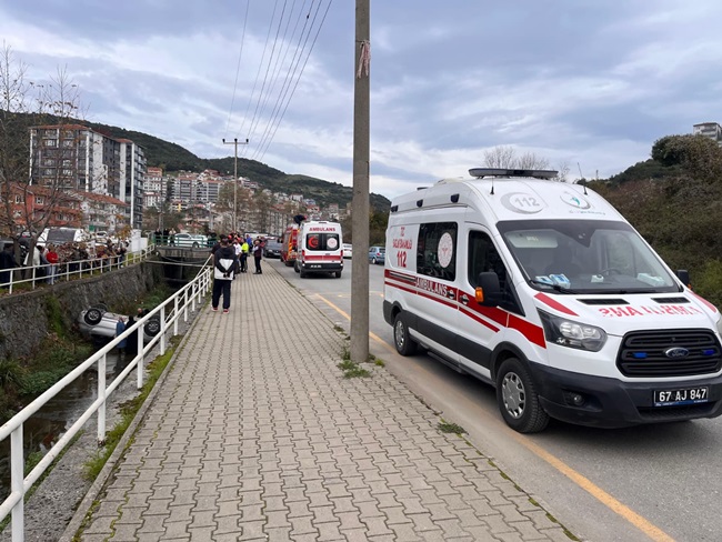 Zonguldak’ın Karadeniz Ereğli ilçesinde meydana gelen trafik kazasında otomobil dere yatağına uçtu.